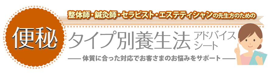 どうぞ、今日の施術から「便秘タイプ別養生法アドバイスシート」をご活用の上、おひとりでも多くの便秘に悩む女性が、毎日快適なお通じで気持ち良く過ごせるようサポートして差し上げてください。