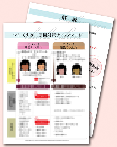 今回は、おひとりでも多くのシミ・くすみで悩む女性にキレイになっていただきたいので、「シミ・くすみタイプ分け・生活アドバイスシート」は、無料配布させていただくこととしました。
