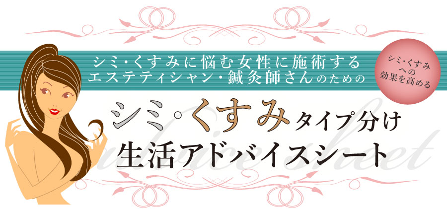 そんな先生方のために「シミ・くすみに悩む女性に施術するエステティシャン・鍼灸師さんのための、シミ・くすみタイプ分け・生活アドバイスシート」を作成いたしました。